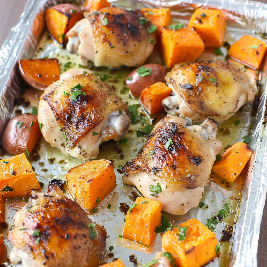 Honey Garlic Roasted Chicken Thighs with Sweet Potatoes