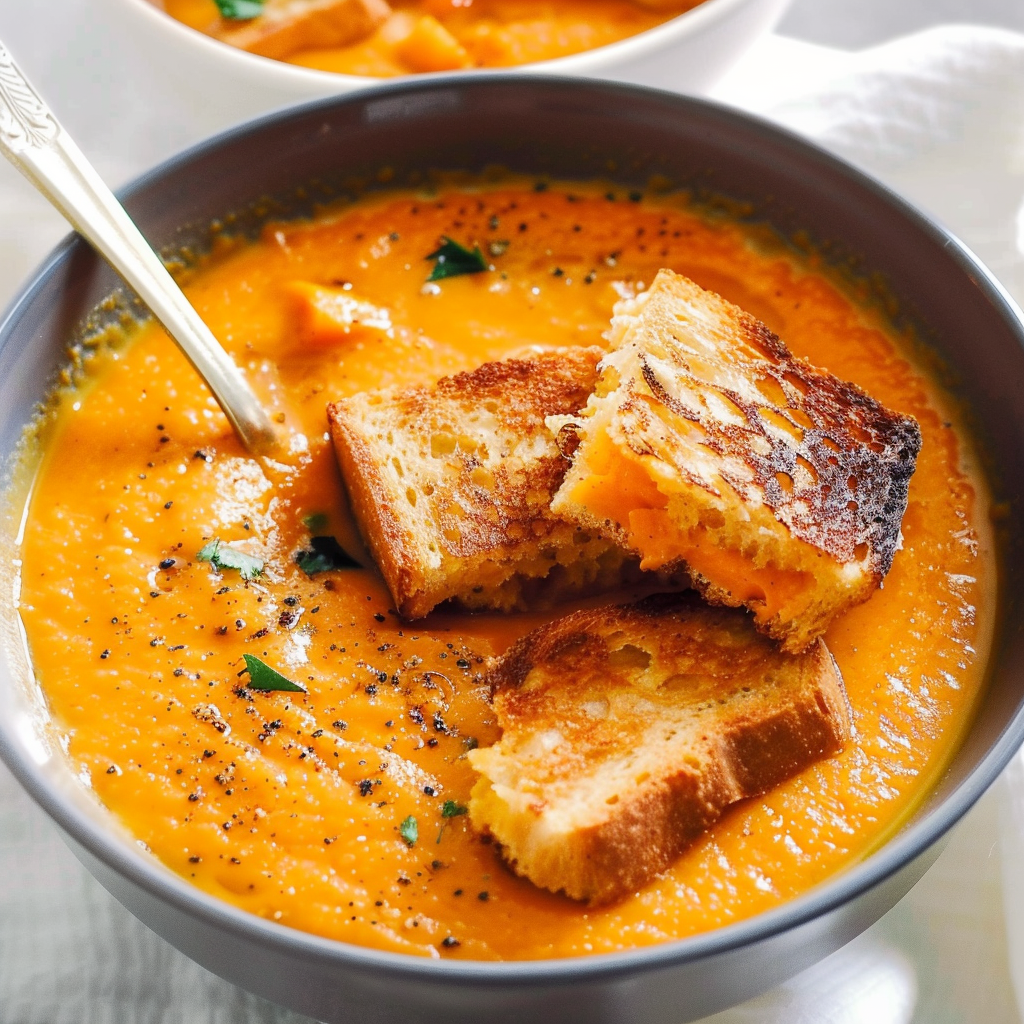 Spicy Pumpkin Soup with Grilled Cheese Croutons